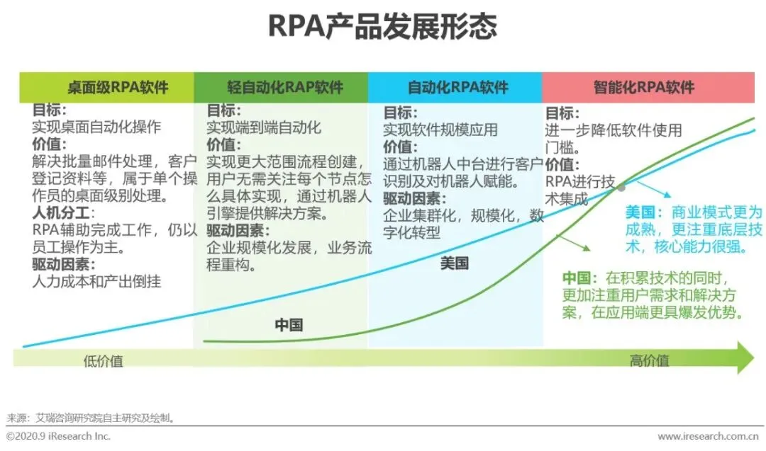 从产品层面来看,中国和美国大体上要完成四个维度的进阶,分别是桌面级RPA软件、轻自动化RPA软件、自动化RPA软件、智能化RPA软件。桌面级产品主要以实现桌面自动化为目标,中国早期发展更多是处理批量邮件、客户资料登记等重复类工作。而轻自动化和自动化RPA产品都是以实现更大范围的流程创建为价值指向,用户无需再关注每个节点如何实现,可以使用RPA软件打通流程接口,增加产品自动化功能及降低使用风险。目前,中国大多数产品处于轻自动化阶段,美国则在完成自动化RPA软件的进阶。未来,随着AI技术的成熟,RPA+AI将打破人类在能力和算力上的瓶颈,进入智能化阶段,美国注重底层技术,综合能力更强,中国则在需求和解决方案端发力,在某种维度上实现对美国的超越。