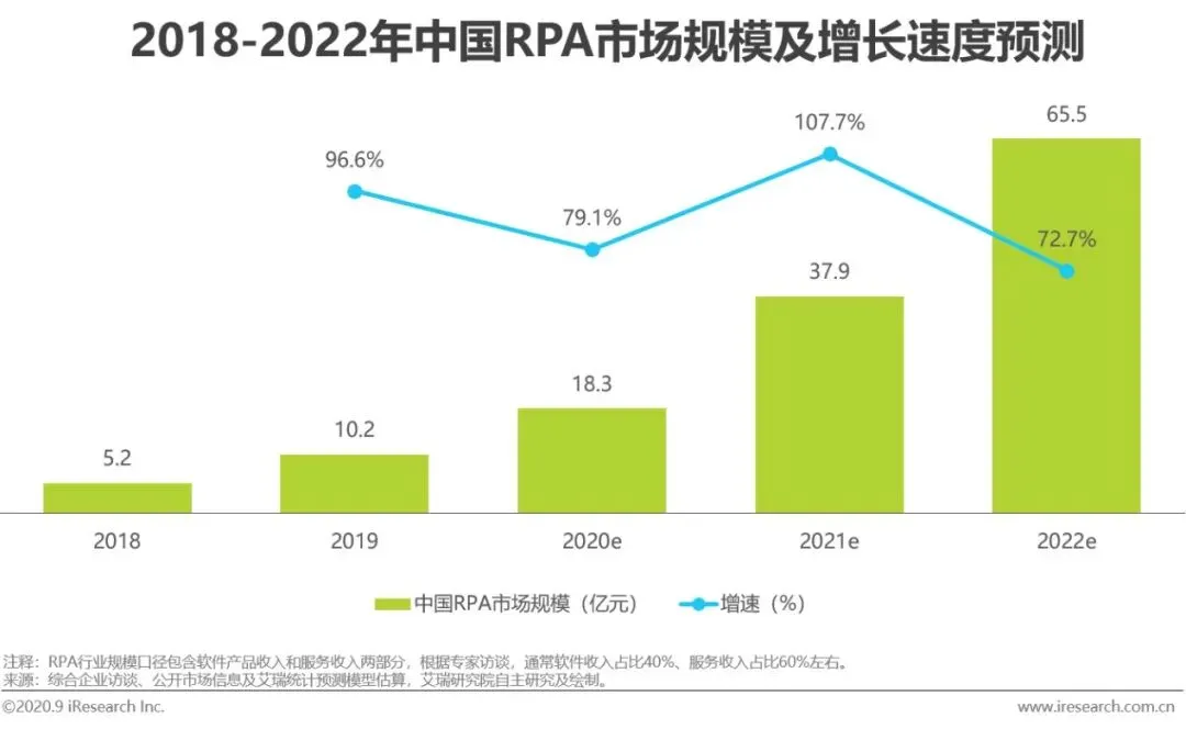 市场规模:2019年RPA市场规模为10.2亿元,较上年增长96.6%。2020年受制于疫情和宏观环境的影响,增速有所下滑为79.1%,但是RPA软件和服务市场现处于蓝海阶段,仍有较大增长空间。据艾瑞咨询预测,未来3年增速仍将维持在70%以上。