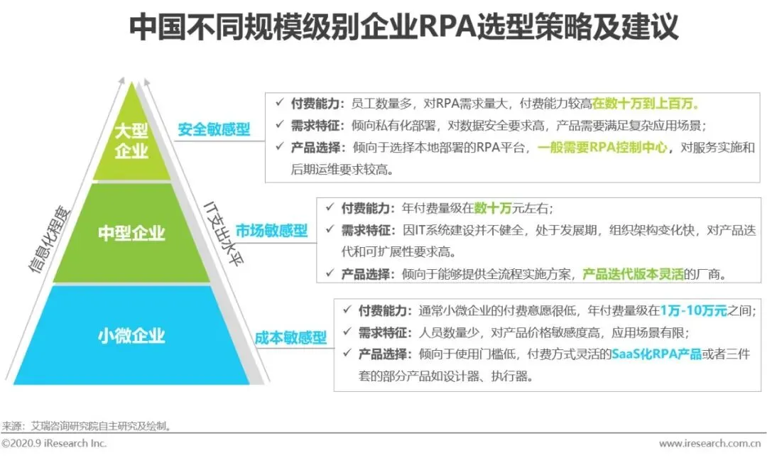不同规模企业对于RPA的选择在付费能力、需求特征、产品功能上存在一定的差异性,大型企业IT支出预算较多,组织架构复杂,跨部门协同工作多,因此对产品和服务实施能力的要求更高,更倾向于能够提供复杂应用场景解决方案的厂商,并在服务实施过程中能够保证交付质量和降低后期维护成本,项目合同在几十万到百万不等;中型企业处于快速发展阶段,组织架构变动大,市场敏感度高,因此在产品的选择上更倾向于技术成熟、迭代快,组件丰富的厂商;小微企业本身受制于应用场景和员工数量的限制,需求相对简单,对成本控制较为敏感,可考虑付费方式灵活的SaaS化RPA产品。