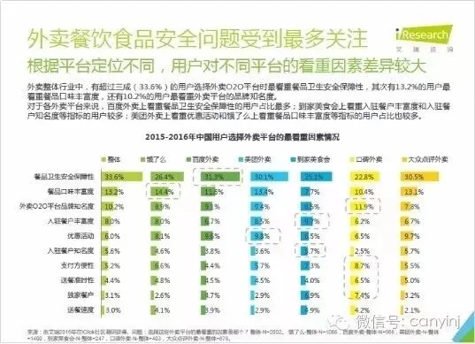 外卖整体行业中,有33.6%的用户选择外卖O2O平台时最看重餐品卫生安全保障性,其次有13.2%的用户最看重餐品口味丰富度,还有10.2%的用户最看重外卖平台的品牌知名度。