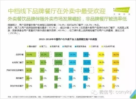 其中,喜欢在饿了么选择连锁快餐的用户最多,占比达到65.2%;54.9%的用户更喜爱在百度外卖中选择时尚热门餐厅,尤其是上班族;40.9%的用户更喜欢在到家美食会上选择只做外卖的餐饮品牌。