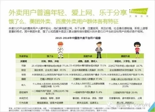 数据显示,外卖O2O平台的整体用户人群呈现年轻化特征,具有爱上网、乐于分享、注重实用、关注价格、社会责任感较强、积极上进等特点。其中,美团外卖、饿了么和百度外卖这三家占据市场份额较大的外卖O2O平台的目标用户特点各不相同。