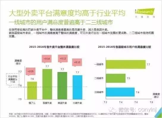 报告对不同层级城市用户的满意度进行了调研,数据显示,一线城市的用户满意度为7.7,普遍高于二三线城市(二线城市为7.5,三线城市为7.6),由此可见外卖O2O在一线城市发展更加成熟。