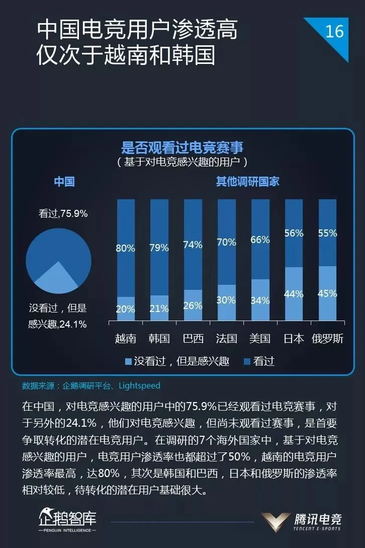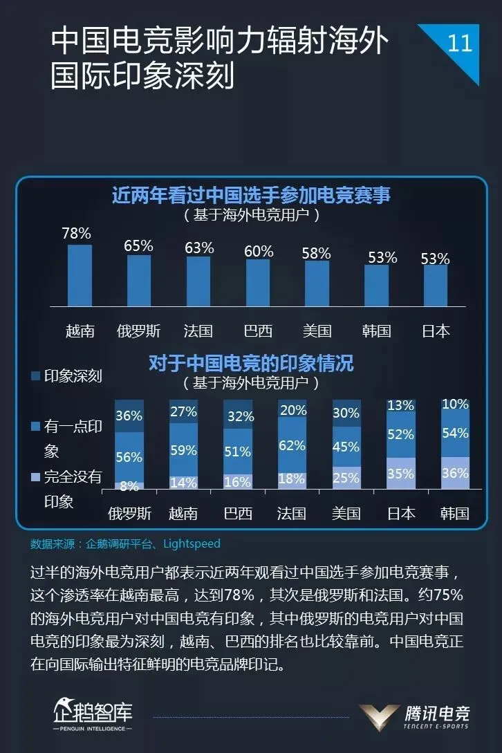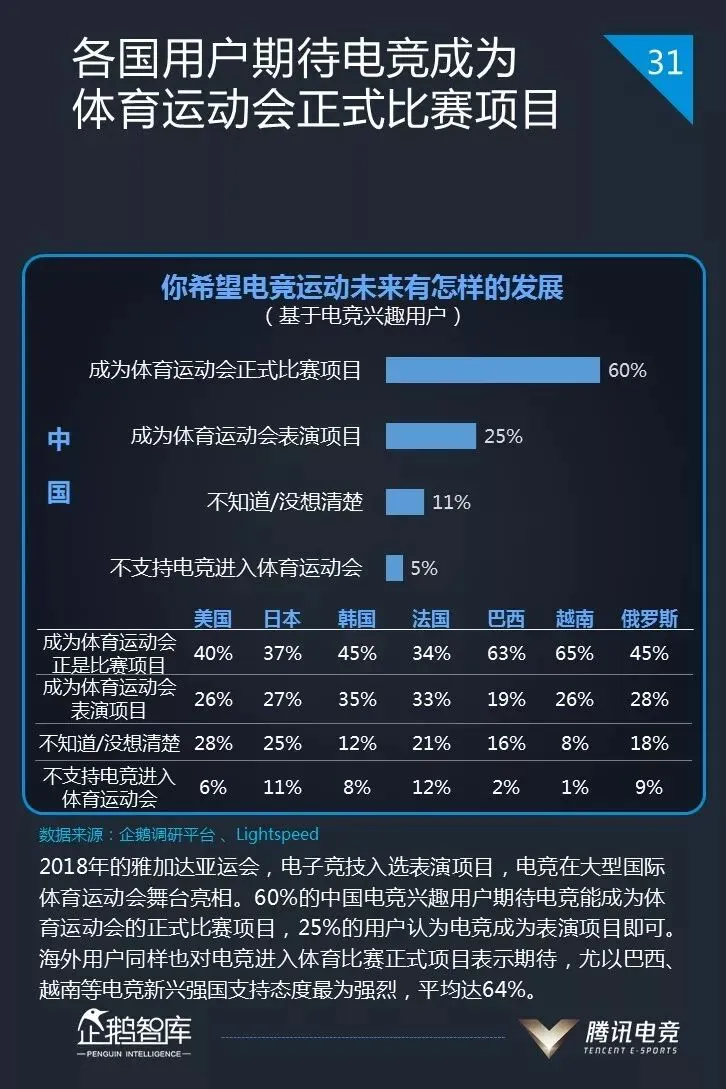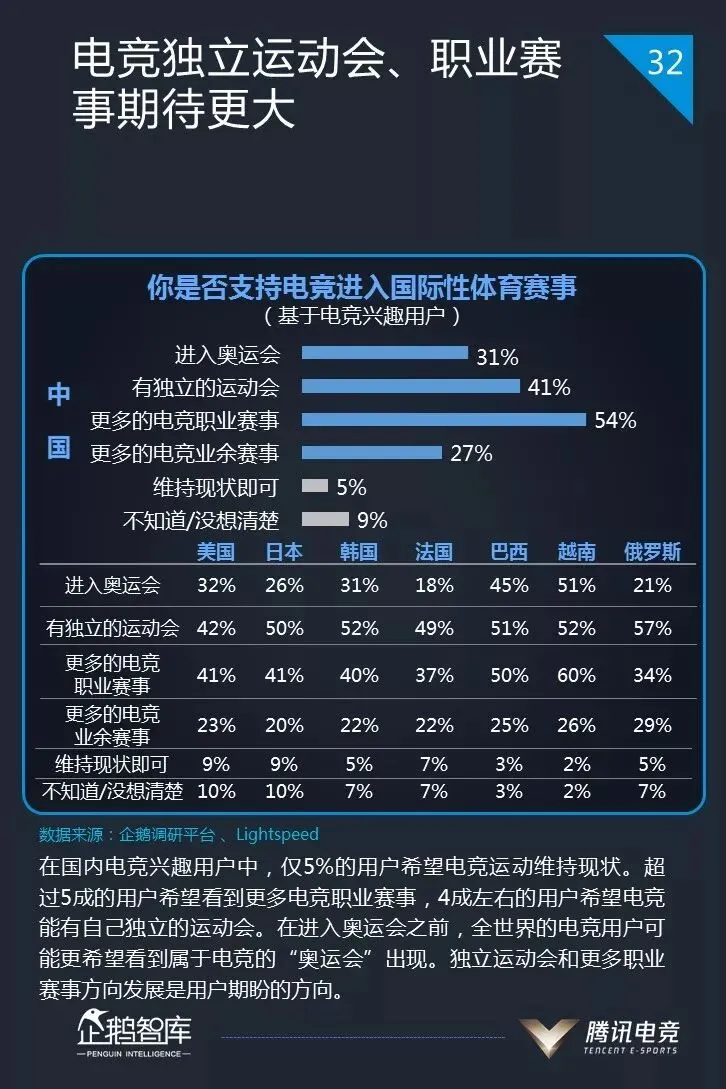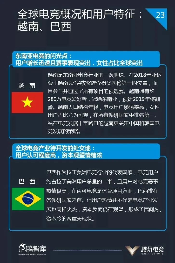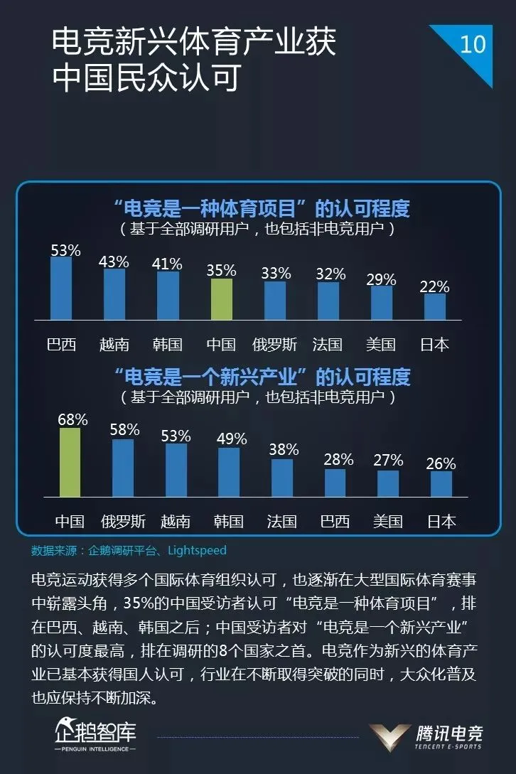 在这一背景下,腾讯电竞再次联合企鹅智库与《电子竞技》杂志,发布这份《世界与中国:2019年全球电竞运动行业发展报告》。今年,除了通过企鹅调研平台,对全国范围内手机网民进行广泛调研之外,我们还首次对海外7个国家,包括美国、日本、韩国、法国、巴西、越南、俄罗斯的用户进行精准调研,以展示不同国家的电竞产业发展情况。