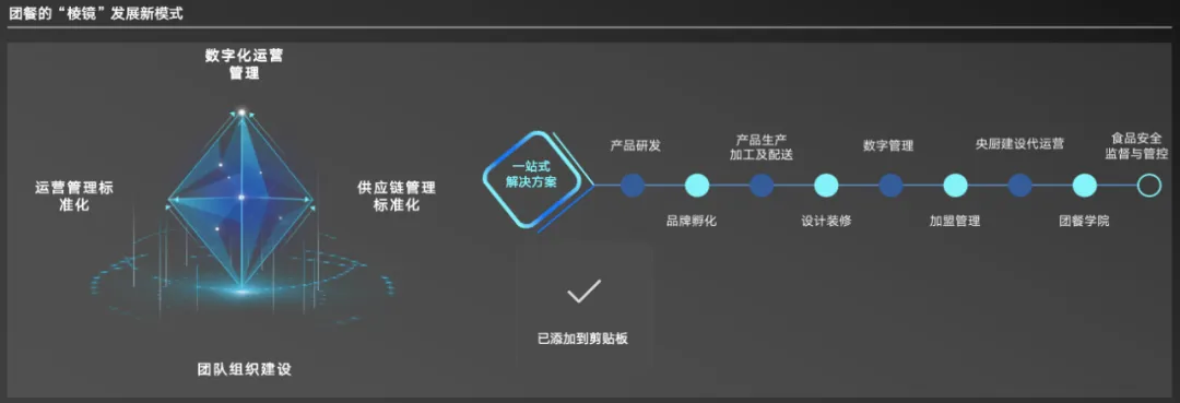 疫情常态化下,团餐业需求特点产生变化,从较为固定、可预测性较高的固定场所需求转变为不确定性较高的灵活需求,对团餐人来说,也是新的转型契机。很多领跑企业积极自救、逆势生长,探索团餐经营新模式。很大程度上,头部企业动向都代表了市场风向标,上一篇《2022中国团餐行业发展报告》(以下简称《报告》)-典型案例分析(上)中,团餐谋对千喜鹤、麦金地、中膳等5家标杆企业的经营模式进行了深入剖析。本篇将深挖德保、速派、美餐、雄伟科技、万喜、芒果青年6家头部企业背后的创新探索与实战经验,为新形势下的团餐行业提供样本梳理。团餐供应链、数字化建设等成为行业热门趋势,不少企业在投入运营中取得了持续稳定的收益。《报告》显示,团餐百强德保以棱镜发展模式,以团餐保障业务为核心,进一步为餐饮经营各个环节提供一站式服务,打造泛餐饮综合内容服务商。德保集团的“棱镜”发展模式内涵是,注重供应链管理标准化、运营管理标准化、数字化运营管理、团队组织建设四个层面的实现,最终打造包括产品研发、品牌孵化、产品生产加工及配送、设计装修、数字管理、加盟管理、央厨建设代运营、团餐学院、食品安全监管与管控几个环节在内的一站式服务。除此之外,德保还打造了DEBO IMAX 2.8数字运营管理体系,即一是以客户为中心的客户生命周期管理系统,二是以业财一体化为目标的业务财务数据结算系统,涵盖CRM、、SRM、OA、ERP、EHR+CPS、BMS等分系统,对客户、员工、管理、业务、供应商、数据等进行线上高效管理,实时掌控总部及超600家食堂经营状况,使管理更智能、高效、透明。