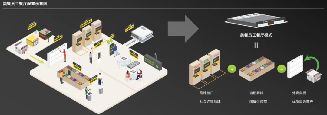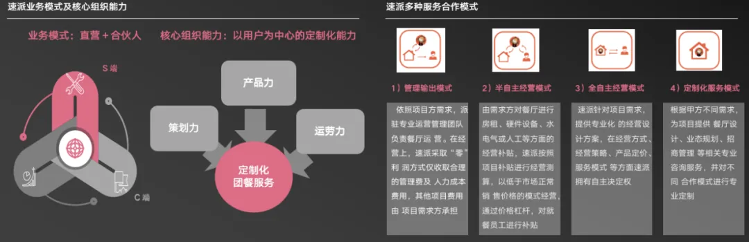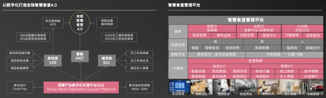 德保现拥有分子公司及关联公司共53家,业务布局国内4个一线城市、8个二线城市和阿联酋、越南2个海外国家,服务600余家合作客户。其团餐业务通过中央厨房及自动烹饪设备配备、智能化结算系统、大数据互通,打造了4T智慧餐厅,并实现了中餐标准化。同样作为团餐数字化转型的先行者,速派围绕业务全链条,完成了从前端收银到后端供应链,覆盖各个主体,一体化、全流程升级:在打造数智化食堂的基础上,合作哗啦啦在前中后端构建起“智能化硬件+智慧化软件+价值化服务”为核心的AI数字系统3.0,全面打通供应链到央厨、到食堂托管等生产运营环节。在业务拓展上,速派采用“直营+合伙人”模式,即在直营基础上,利用数字化3.0给有资源的B端/C端赋能,建立创业平台,并可提供定制化服务。根据甲方不同需求,为项目提供餐厅设计、业态规划、招商管理等相关专业咨询服务,并对不同合作模式进行专业定制。在运营管理方面,公司致力于敏捷化的组织体系,以业务功能为导向设立运营支持、营销支持和后勤支持等中心,打破部门之间的界限。同时,总部可根据不同的需求场景,迅速形成灵活的跨部门虚拟团队,无边界协作高效完成各项工作任务。时至今日,速派旗下拥有4个种植基地、25个食材配送中心、6大中央厨房、100多家托管餐厅,并形成了完善的大型团餐服务保障架构。疫情的不确定性正进一步加快传统团餐行业向数字化转型的脚步,数字化团餐平台美餐释放自身技术优势,为企业客户提供多场景、多供应商、场内场外结合的无界企业用餐解决方案。《报告》显示,美餐研发了先进的管理系统,通过自营数万家供应商合作,以“多元供给 + 数字化”战略,为企业客户提供创新员工餐厅、外卖订餐、到店消费、活动餐等综合用餐服务,并为客户提供灵活多样的解决方案,帮助客户全面提升员工餐饮体验和管理效率。同时,公司还创新了整个餐厅的设计及配置等,引入了新兴的、类型丰富的供应商及营运服务。如智能自助餐线、品牌档口点餐自提、品牌店中店桌上点餐、周边商户外卖自提以及智能餐柜,使用户可便捷地在智能餐柜自助领取餐品,一定程度上打破了时间限制并解决外卖丢失问题。值得一提的是,企业还提供除传统团餐餐饮服务外创新的服务。如为企业福利多种场景提供更多优质的增值服务,包括活动餐、生日会、下午茶、零食、福利礼品、营养健康餐、贵宾餐、卡券在线兑换等。