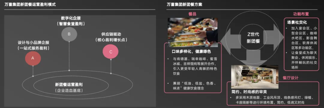与此同时,雄伟科技全链采用数字化技术打造的餐饮服务智慧综合体解决方案:超级厨房,服务内容从规划设计、建设集成到营运管理均覆盖,旨在用三倍的人效提供全品类、全时段的餐饮服务,实现服务自助化、生产标准化、运营数字化。超级厨房建成后,食堂内无需专门的服务人员、专业的厨师、专业的管理人员在场。消费环节实现消费者按需取餐,自助结算;制作环节智能烹饪及智能配餐,可提供600道各色菜品;管理环节辅助主要管理者用数据做决策。面对万亿级的团餐市场“蛋糕”及新兴消费需求,万喜集团在团餐业务基础上,更侧重于开拓Z世代新团餐业务。通过深入洞察Z世代多样化、品牌化、场景化、智能化等方面的需求,顺势引入深夜食堂、网红餐厅等,并在品质、品牌、场景等多维度进行升级。如功能布置上实现场景社交化、餐品上实现口味多样化、餐厅设计上实现简约/时尚。在管理方面,集团选择探索“部门企业化运营”路线,在传统团餐企业向团餐企业服务型企业变革转型之路上走在前端;自研数字化运营管理大中台,实现大成本端、食品安全端、大薪酬端、营业收入端、综合费用端等全链路打通,智慧食堂可对数据进行聚合、挖掘从而辅助运营决策分析,项目经理可用手机快速完成管理,以数字化技术推动团餐运营效率提升。