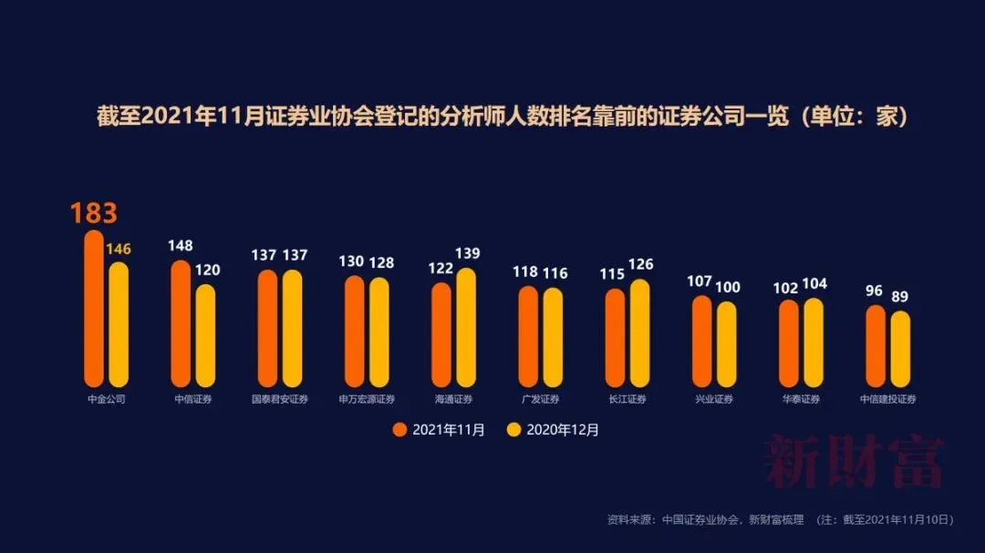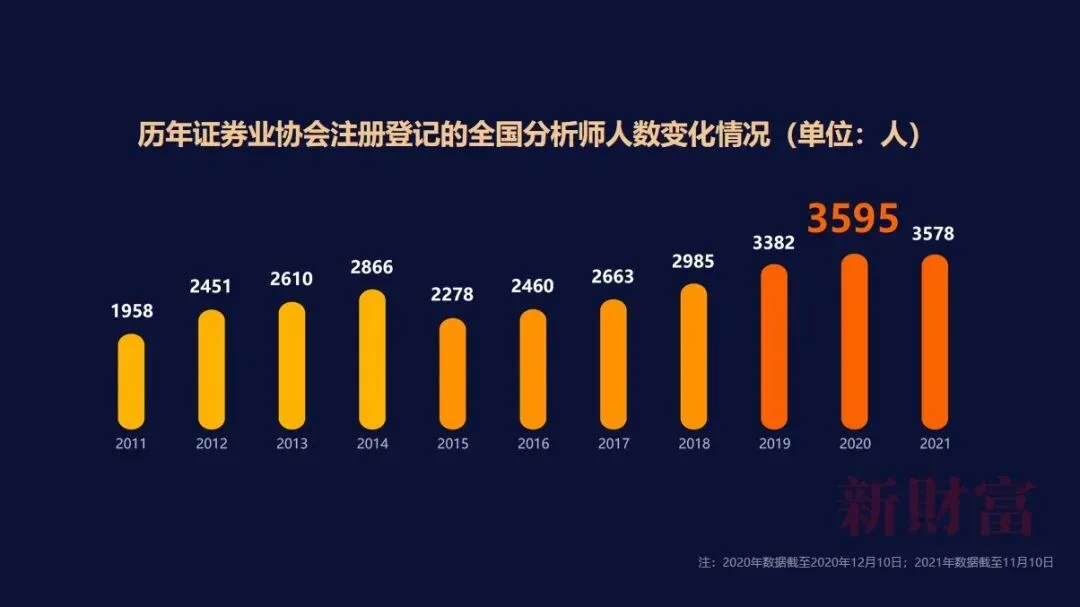 近两年资产管理机构大发展,证券研究人员扩容趋势却显现阶段性放缓趋势。截至2021年11月,证券业协会官网公示的分析师人数达3578人,同比减少约0.5%,结束了连续5年扩容的发展史。其中,30家券商登记的分析师人数在40人以上,同比减少3家,18家券商登记的分析师人数超过60人,同比减少5家,9家券商登记的分析师人数超过100人,同比持平。
