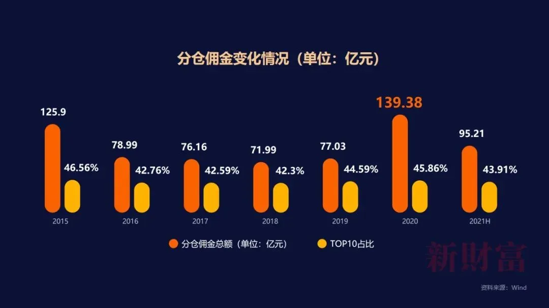 与此同时,分仓佣金排名前10的券商,佣金总量在全行业的占比一直在42%-46%之间徘徊,显示行业竞争激烈,集中度较低。此外,随着券商财富管理产品销售销售额的攀升,研究佣金的压力进一步提升。
