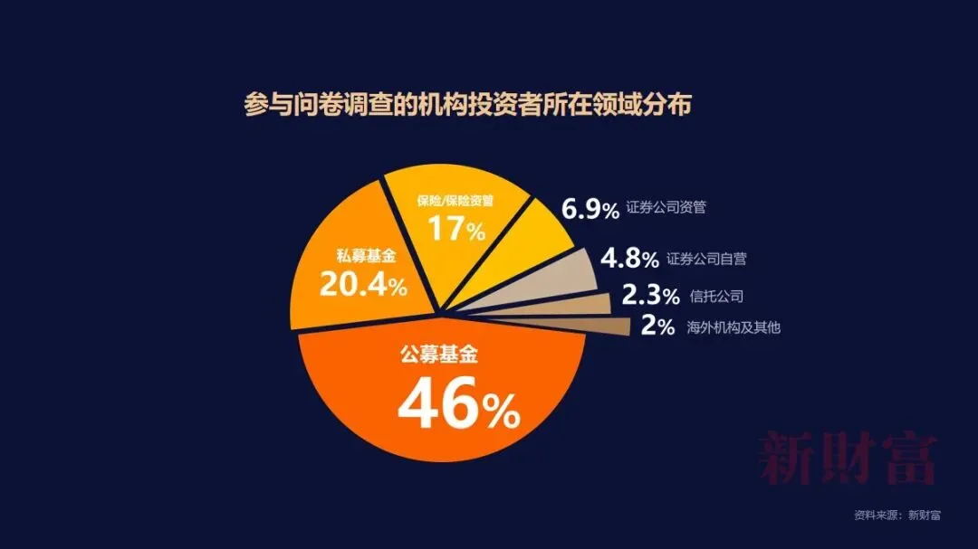 2021年9月,我们对1000余家机构投资者发放问卷,截至当月末,参与问卷的机构投资者来源中,公募基金占比46%,私募基金占比20.4%,保险/保险资管占比17%,券商资管占比6.9%,券商自营占比4.8%,信托公司占比2.3%,另有2%来自QFII/RQFII/海外投资机构及财务公司等机构。