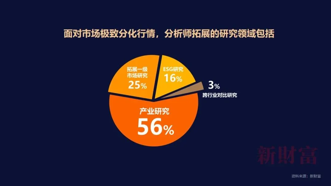 在拓展的研究领域方面,选择拓展产业研究方向的分析师占比最高,达56%,拓展一级市场研究的占比25%、ESG研究的占比16%、跨行业对比研究的占3%。