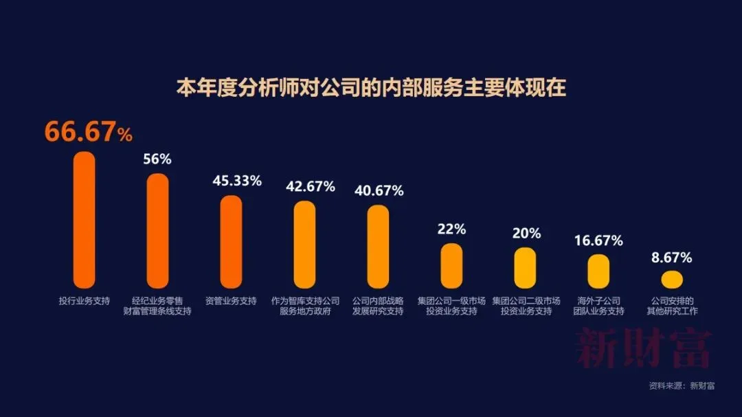 市场高度竞争,也促进研究能力的加速提升,这为更好地服务券证券公司质量发展,打下了坚实的基础。对证券分析师的调查显示,近7成分析师反馈,过去一年其所在公司肯定了研究对内支持的重要性,这一数据已连续3年攀升。内部支持工作中,投行业务占据主流,其次是经纪零售业务、资管业务等的研究支持,值得注意的是,“作为智库,支持公司服务地方政府”这一选项也获得了较高的选择率。