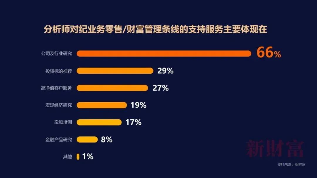 关于对经纪业务零售/财富管理条线的支持,主要体现在公司及行业研究,选择率为66%,投资标的推荐和高净值客户服务,选择率分别为29%和27%。