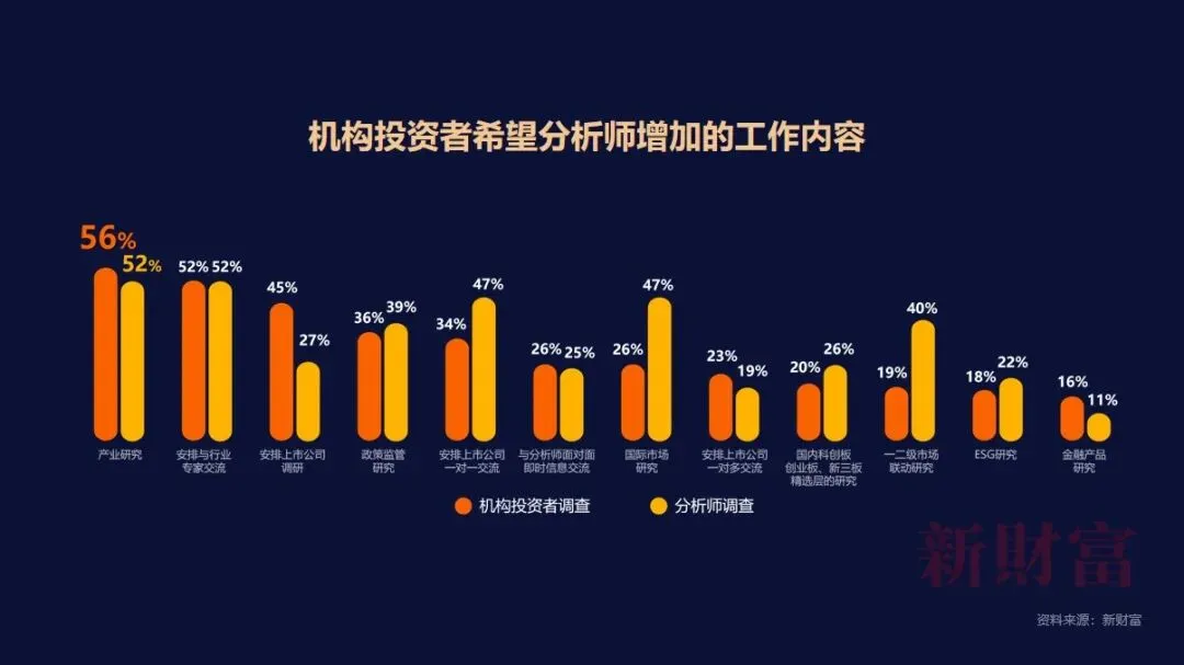 与此同时,对机构投资者的调查显示,当前市场行情下,最希望分析师增加的工作内容方面,排在首位的也是产业研究,选择率为56%,其次是安排与行业专家交流,选择率为52%,排第三的是安排上市公司调研,选择率为45%。此外,政策监管研究、安排与上市公司一对一交流,也分别获得了36%和34%的选择率。