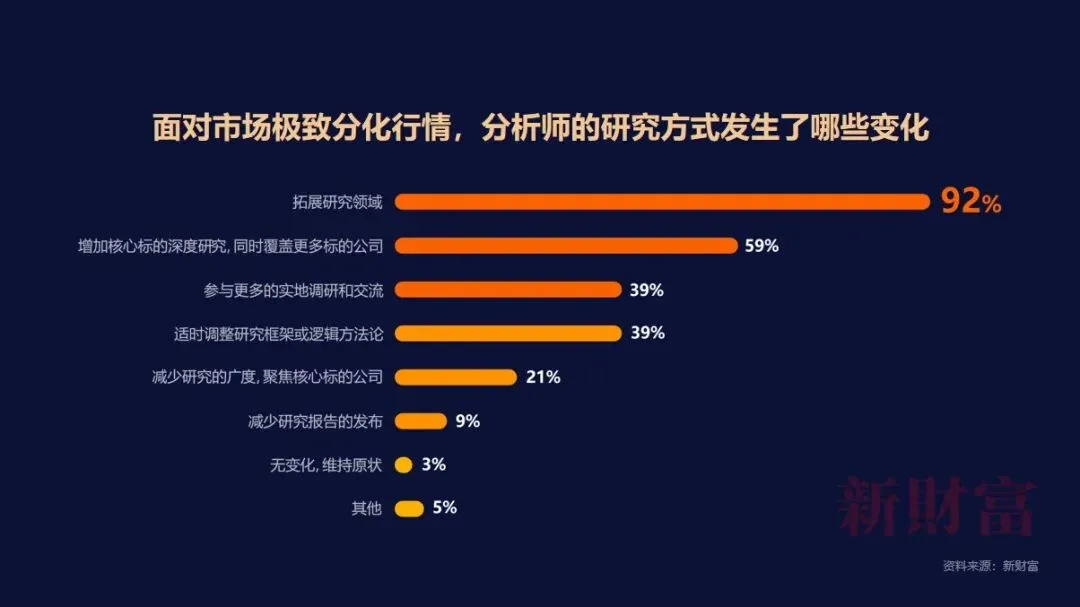 大部分受访分析师表示,在市场极致分化行情面前,首选的破局方式是拓展研究领域, 92%的受访分析师对此有共识。除此之外,59%的分析师表示,极致行情使其增加对核心标的公司的深度研究,同时增加研究广度,覆盖更多标的公司。也有21%的受访分析师表示,会适当进行研究收缩,减少研究的广度,聚焦核心标的公司。还有39%的分析师表示,当前行情下会更多地参与实地调研和交流,也有39%的受访分析师表示会适时调整研究框架或逻辑方法论。