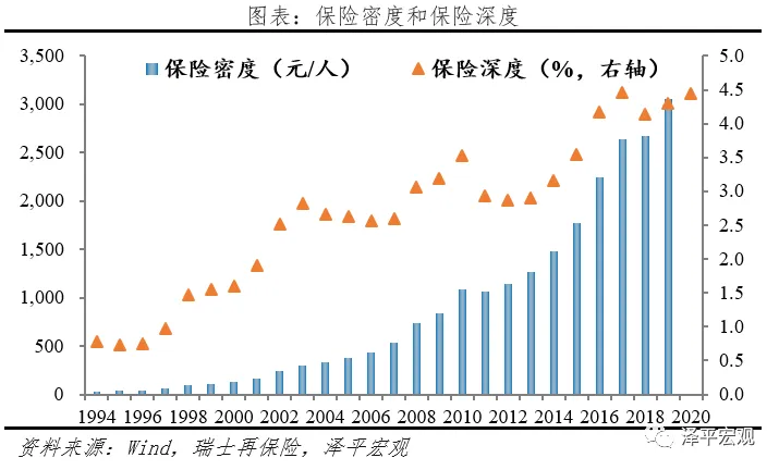 总体来看,经过多年深耕,中国保险深度(保费/GDP)从1994年0.77%提升至2020年4.45%,保险密度(人均保费)从31.55元提高至2019年3051元,但仍低于全球平均保险深度7.0%和790美元保险密度水平,在众多领域保险消费存在缺口。