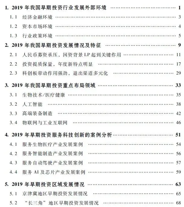 今年是协会编撰《中国早期投资行业发展报告》的第四年。报告主体由外部环境、发展情况及特征、重点布局领域、服务科技创新、服务国家区域发展战略情况、问题与趋势分析,共六章组成。本报告数据主要来源以清科研究中心旗下私募通为主,引用的第三方机构数据均已注明。与以往报告相比,今年的报告数据挖掘得到进一步强化、对数据的分析解读更为深入,并拓展了新的分析维度。具体表现为:在第二章我国早期投资市场募资情况分析内容里增加了关于基金投资者类型与国资背景的分析;在第四章结合我国早期投资重点布局的科技领域,首次采用案例分析的方式展示我国早期投资服务实体经济和支持科技创新的一般路径和取得的成效;第六章主要回顾并总结了2019年早期投资行业面临的新问题、新挑战,同时针对目前经济环境变化以及2020年初开始蔓延的新冠肺炎疫情的影响,分析并展望早期投资行业2020年的发展趋势。
