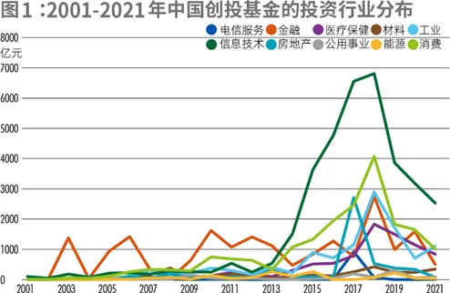 拉长时间来看,技术化、硬核化的投资趋势更为明显。2001年至2021年12月,信息技术、消费、医疗保健是中国PE/VC机构投资规模最大的行业,其规模占比从2003年最低至17.15%,最高在2016年达到76.29%(图1)。