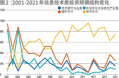 不过,2017年开始,其占比已开始震荡下降,2020年仅有62.66%,2021年为74.37%。与之相反,技术硬件与设备、半导体与生产设备等硬件相关的投资规模占比则从2016年的3.9%上升至30%左右,2020年最高达到37.34%。