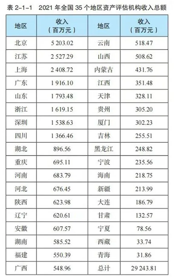 资产评估机构地域分布。2021年,全国东部、中部、西部地区的评估机构数量分别为3231家、1492家、1401家,数量前十的省级行政区按次序排列分别为山东省、江苏省、北京市、四川省、广东省、浙江省、河南省、河北省、辽宁省和湖北省。
