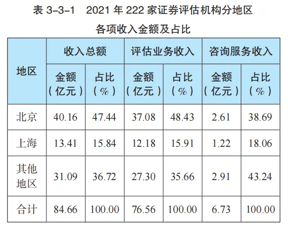 截至2021年底,222家全国证券评估机构分布于27个省、市(直辖市或计划单列市)。其中,在北京注册的证券评估机构71家,在上海注册的证券评估机构20家,合计占全国222家证券评估机构的41%。2021年222家证券评估机构分地区各项收入金额及占比见表3-3-1,从中可见,在北京、上海注册的证券评估机构收入总额、评估业务收入、咨询业务收入占比均超过一半,分别为63.28%、64.34%、56.82%。
