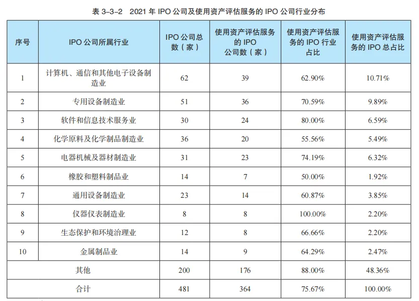 2021年,IPO公司及使用资产评估服务的IPO公司行业分布见表3-3-2,从中可见,2021年实现IPO公司最多的前四个行业是计算机、通信和其他电子设备制造业,专用设备制造业,软件和信息技术服务业以及化学原料及化学制品制造业,与以前年度类似。