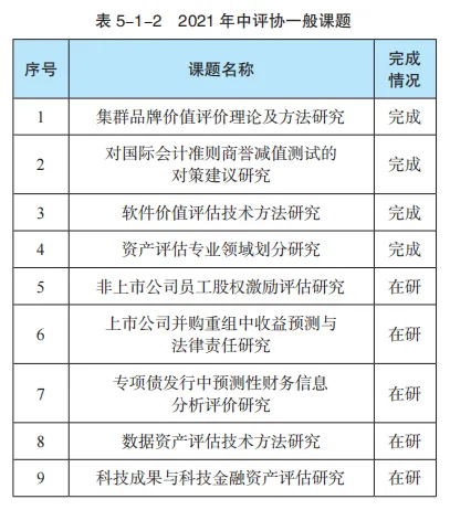 2021年,中评协完成一般研究课题4项,新立项并推进一般课题研究5项,详见表5-1-2。一般课题项目深入研究评估方法和评估专业领域,为评估实践提供理论支持。主要涉及知识产权评估、商誉资产评估、数据资产评估等。
