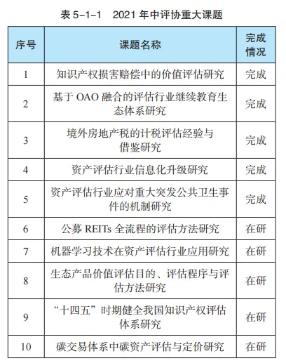 2021年,中评协完成重大研究课题5项,新立项并推进重大研究课题5项,详见表5-1-1。重大课题项目贯彻落实国家重大战略决策部署,聚焦行业发展重要问题。一是关注评估热点和时事热点,开展公募REITs全流程的评估方法研究、资产评估行业应对重大突发公共卫生事件的机制研究等课题研究。二是关注行业信息化,开展资产评估行业信息化升级研究、机器学习技术在资产评估行业应用研究等课题研究。三是关注资产评估继续教育生态体系研究,开展基于OAO融合的评估行业继续教育生态体系研究等课题研究。