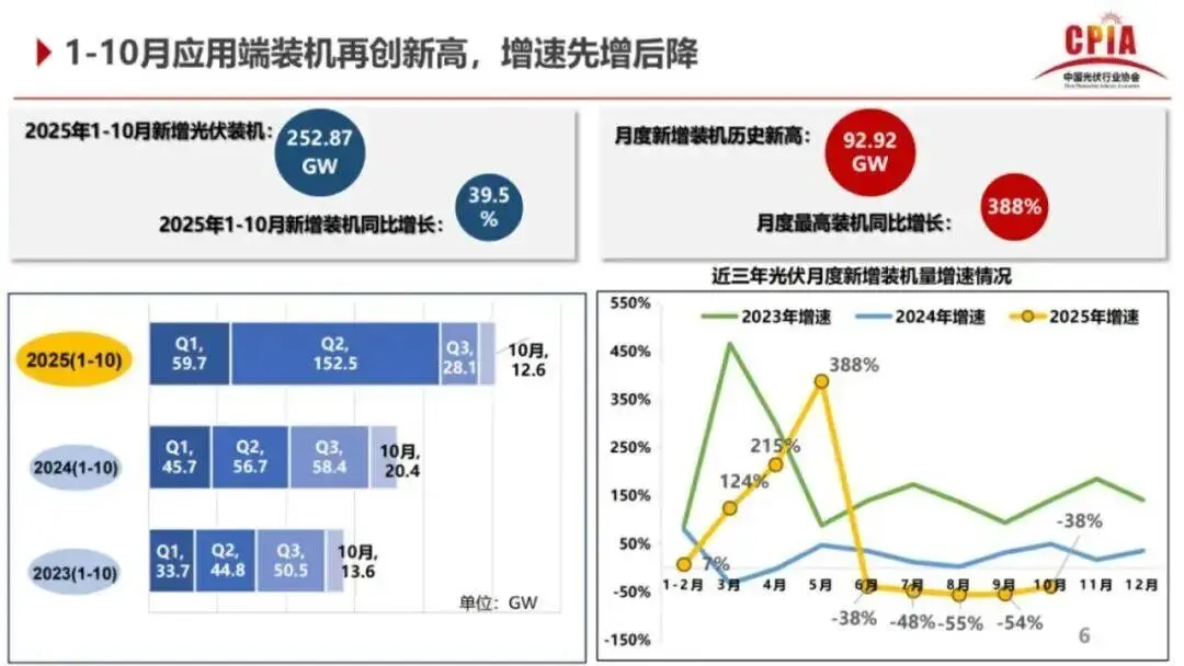 2025 年,中国光伏行业在变化中开启了转型之路。制造端的情况有好有坏,多晶硅产量同比下降 29.6%,但组件产量增长了 13.5%。应用端的新增装机量达到 252.87GW,同比增长 39.5%,不过增速上半年快、下半年慢,呈现 “脉冲式” 变化。