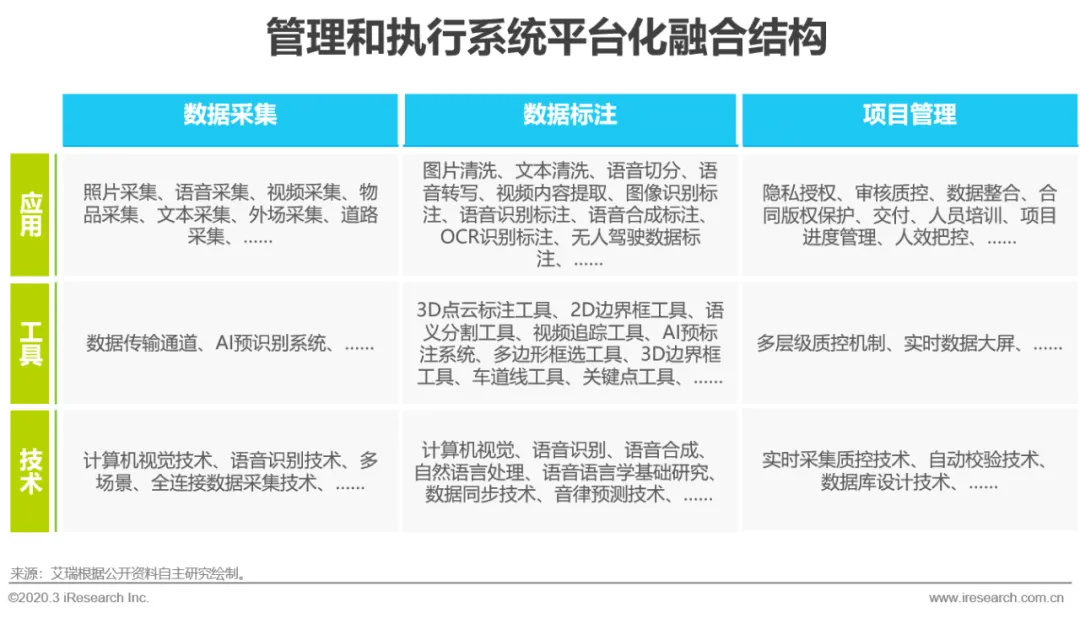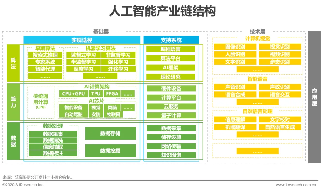 自从2012年深度学习在图像和语音方面产生重大突破后,人工智能便真正具备了走出实验室步入市场的能力,2016年AlphaGo的胜利再次引爆行业,成功唤起了中国市场的兴趣,时至今日,人工智能的商业化在中国得到了长足发展,在安防、金融、企服等领域纷纷落地开花,同时也真正意义上衍生出了一套完整的产业链。AI产业链可以分为基础层、技术层和应用层,基础层按照算力、数据和算法再次划分,对整体上层建筑起到支撑作用;技术层根据算法用途分为计算机视觉、智能语音、自然语言处理等,是AI最引人注目的环节;应用层则按照不同场景的需求定制开发专属服务,是AI真正赋能行业的方式。目前人工智能商业化在算力、算法和技术方面基本达到阶段性成熟,想要更加落地,解决行业具体痛点,需要大量经过标注处理的相关数据做算法训练支撑,可以说数据决定了AI的落地程度,而AI基础数据服务行业又鲜有关注,因此本报告承接艾瑞《2019年中国人工智能基础数据服务白皮书》,再次挖掘该行业的现状和发展,展示其真实的一面。