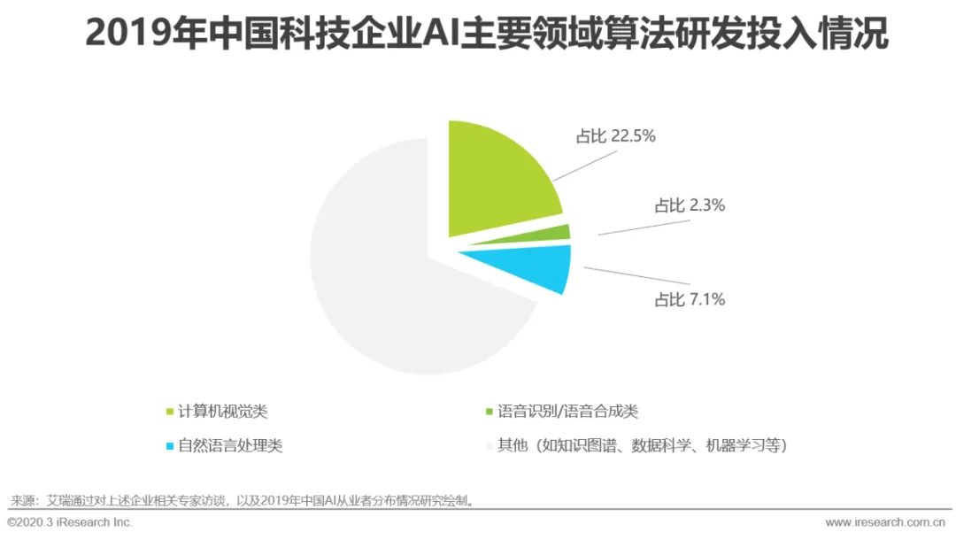 根据数据分析,2019年中国科技企业技术研发投入约为4005亿元,其中人工智能算法研发投入占比为9.3%,超370亿元,且大部分投入来自互联网科技公司。主要AI算法应用领域——计算机视觉、语音识别/语音合成,以及自然语言处理占比分别为22.5%、2.3%和7.1%,三者中计算机视觉相关算法研发投入占比最大,这与视觉相关创业公司数量、产业需求和政策导向呈正相关联系,计算机视觉目前仍是中国最具代表性的AI应用技术。