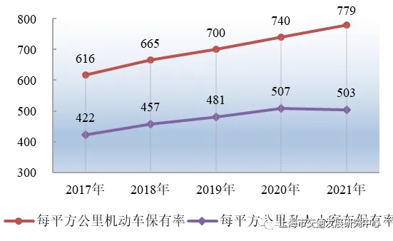 【机动车保有量】截至2021年底,全市注册机动车保有量(含“沪C”牌照机动车)494.2万辆,较上年增长5.4%。其中,汽车保有量474.3万辆,增长5.7%。全市注册机动车千人拥有率为199辆/千人,同比增长5.3%。单位面积机动车保有率为779辆/平方公里,较上年增长5.4%。其中,单位面积私人小客车保有率为503辆/平方公里,同比下降0.7%。