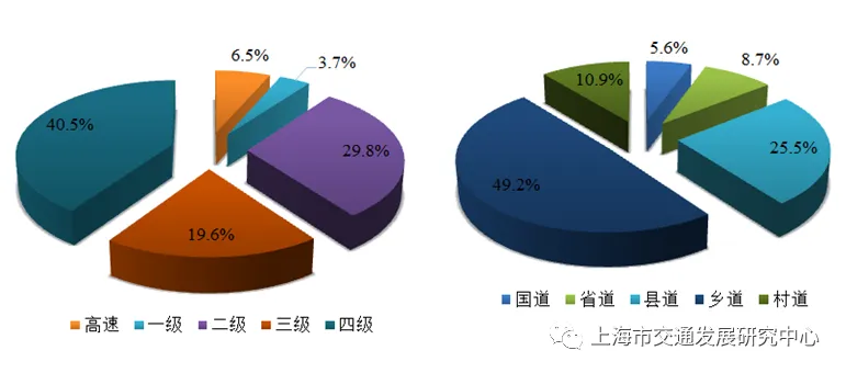 【公路设施构成】 按技术等级划分,高速公路、一级公路、二级公路、三级公路、四级公路分别占总里程的6.5%、3.7%、29.8%、19.6%、40.5%。按行政等级划分,国道、省道、县道、乡道、村道分别占5.6%、8.7%、25.5%、49.2%、10.9%。