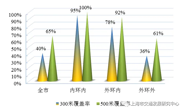 【公共汽(电)车站点覆盖率】截至2021年底,全市公共汽(电)车站点(含枢纽站、首末站和中途站)300米半径的服务覆盖率为40%,其中,外环内达到78%,与上年持平。全市公共汽(电)车站点500米半径的服务覆盖率达到64%,其中,外环内达到92%(扣除水域和大型绿地),与上年持平。