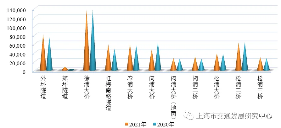 【越江桥隧交通量】 2021年,中心城外环线以内工作日总体越江通道日均流量达到100.5万辆次,同比增长9.7%,与2019年同期水平略有增长。中北部区域和南部区域增幅较为明显,北部及中南部区域相对更为稳定。郊区跨黄浦江通道流量69.1万辆/日,同比增长3.4%。道路平均拥挤度为0.96,最拥挤的通道是徐浦大桥、外环隧道、奉浦大桥,拥挤度均超过1。