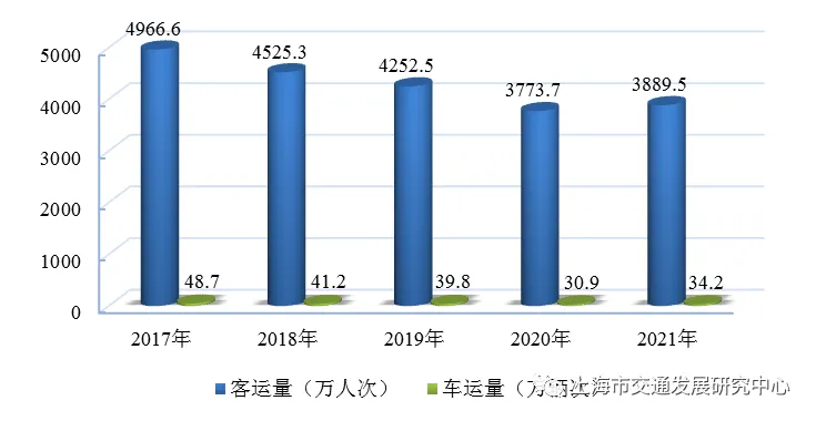 图3.9 近五年黄浦江轮渡客运量及车运量