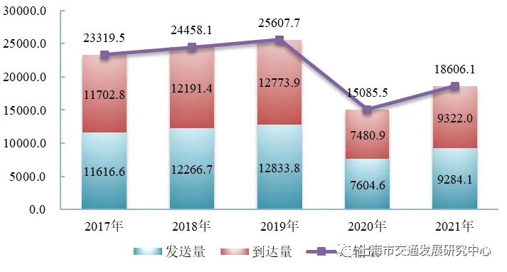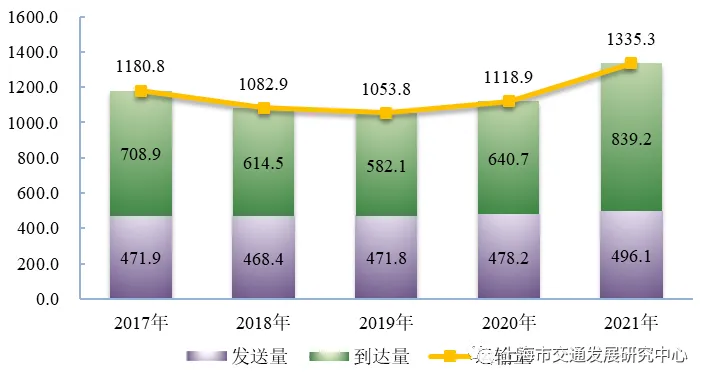 【铁路货物到发量】 2021年,上海完成铁路货物运输量1335.32万吨,同比增长19.3%。其中,货物发送量496.1万吨,同比增长3.8%;货物到达量839.2万吨,同比增长31%。完成货物周转量187547万吨公里,同比增长19.7%。