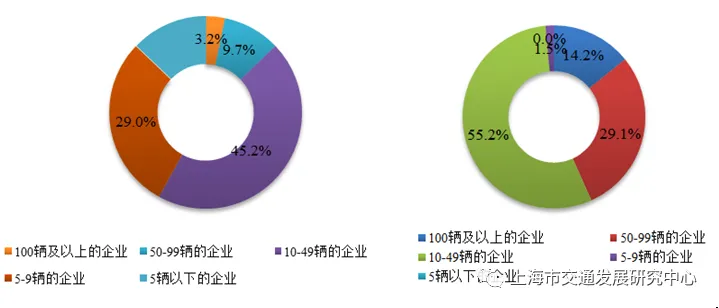 【省际客运企业】截至2021年底,上海市共有道路旅客运输企业134户,较上年减少3户;户均车辆67辆/户,较上年增加6辆/户。其中,兼营班车客运和包车客运的企业31户,较上年减少3户;仅经营包车客运的企业103户,与上年持平。从车辆规模看,10至49辆的企业占比较大,在班车和包车客运企业中分别占45.2%和55.2%。