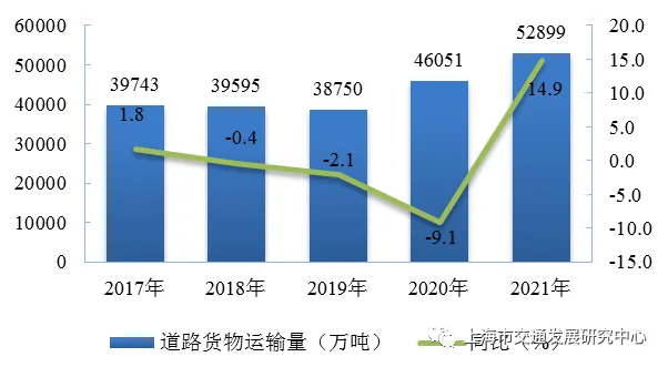 【道路货运量】 2021年,上海市道路货物运输量52899万吨,同比增长14.9%,占全社会货物运输总量34.1%,占比上升1个百分点。