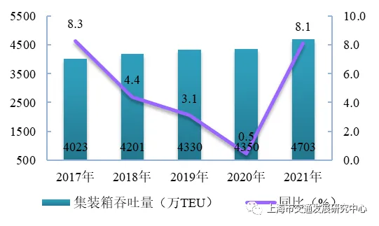 【集装箱吞吐量】 2021年,上海港完成集装箱吞吐量4703.3万TEU,较上年增长8.1%。按空重箱来分,重箱占72.4%,空箱占27.6%。按进出港来分,进港占49.4%,出港占50.6%。按航线来分,国际航线占72.6%,内支线占11.5%,内贸线占15.9%。