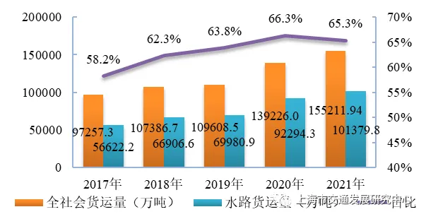 【对外货运】2021年,上海市完成货物运输量155212.1万吨,同比增长11.5%。从结构来看,水路货物运输量最大 ,占比为65.3%。