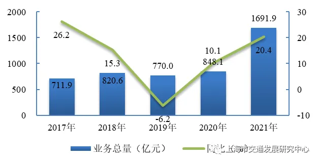 【邮政行业总体情况】 2021年,上海市邮政行业业务收入(不包括邮政储蓄银行直接营业收入)累计完成1691.9亿元,同比增长20.4%。