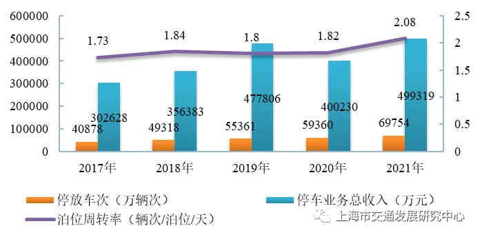 【停车服务】2021年,上海市道路停车场停放量总计2811.7万辆次,较上年下降0.1%;经营性公共停车场停放量总计69754万辆次,较上年增长17.5%。