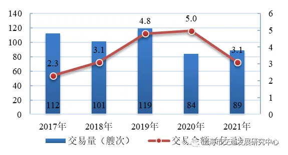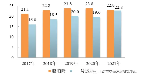 【航运保险及船舶交易】2021年,上海地区船舶险和货运险业务量达到45.7亿元,较上年上升5.3%,占全国船货险业务量的20.1%。受新冠肺炎疫情影响,上海航运交易所船舶交易鉴证业务持续低迷,共完成船舶交易89艘次,较上年上升6.0%;交易总价值3.1亿元,同比下降37.6%;完成船舶评估34艘次,同比上升61.9%。