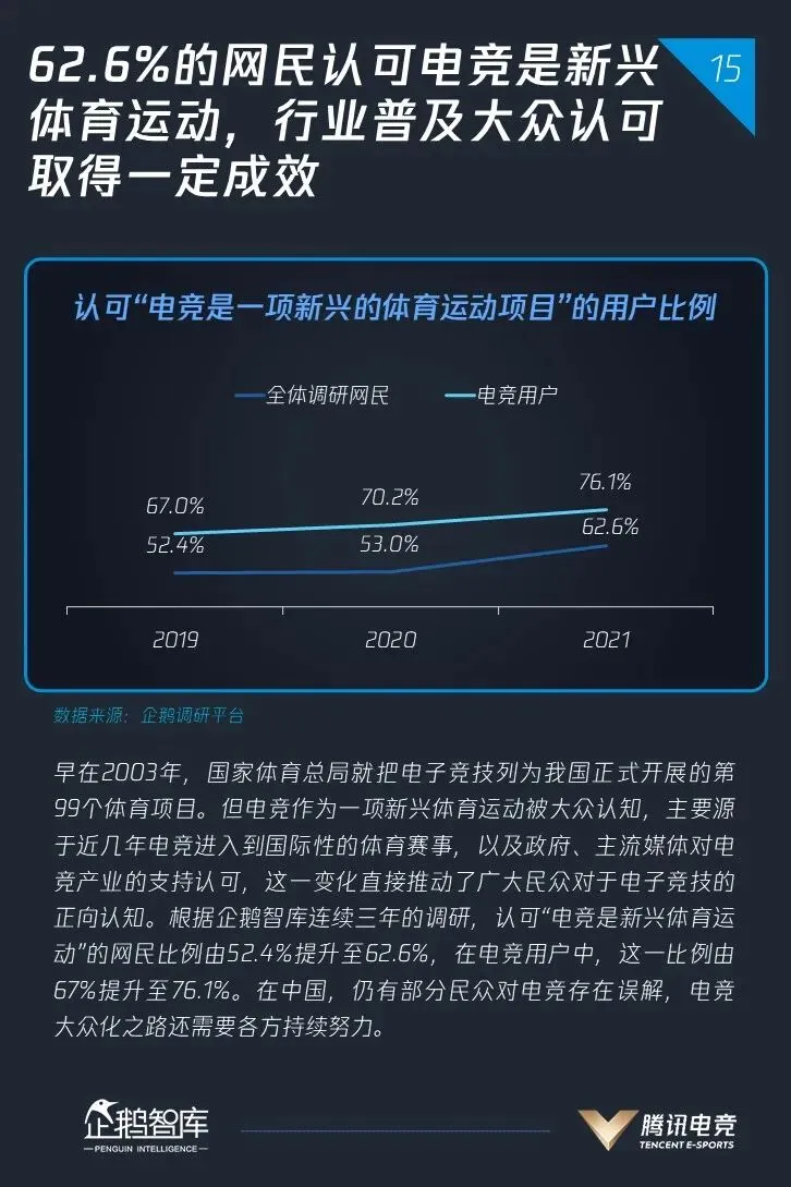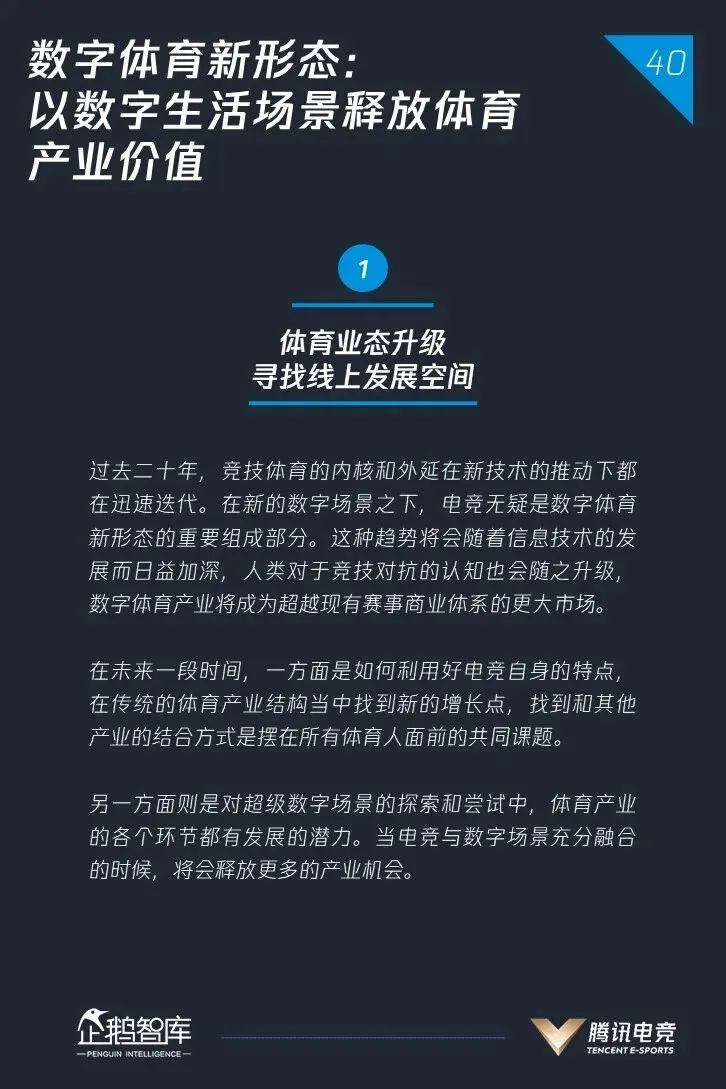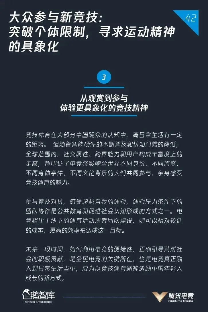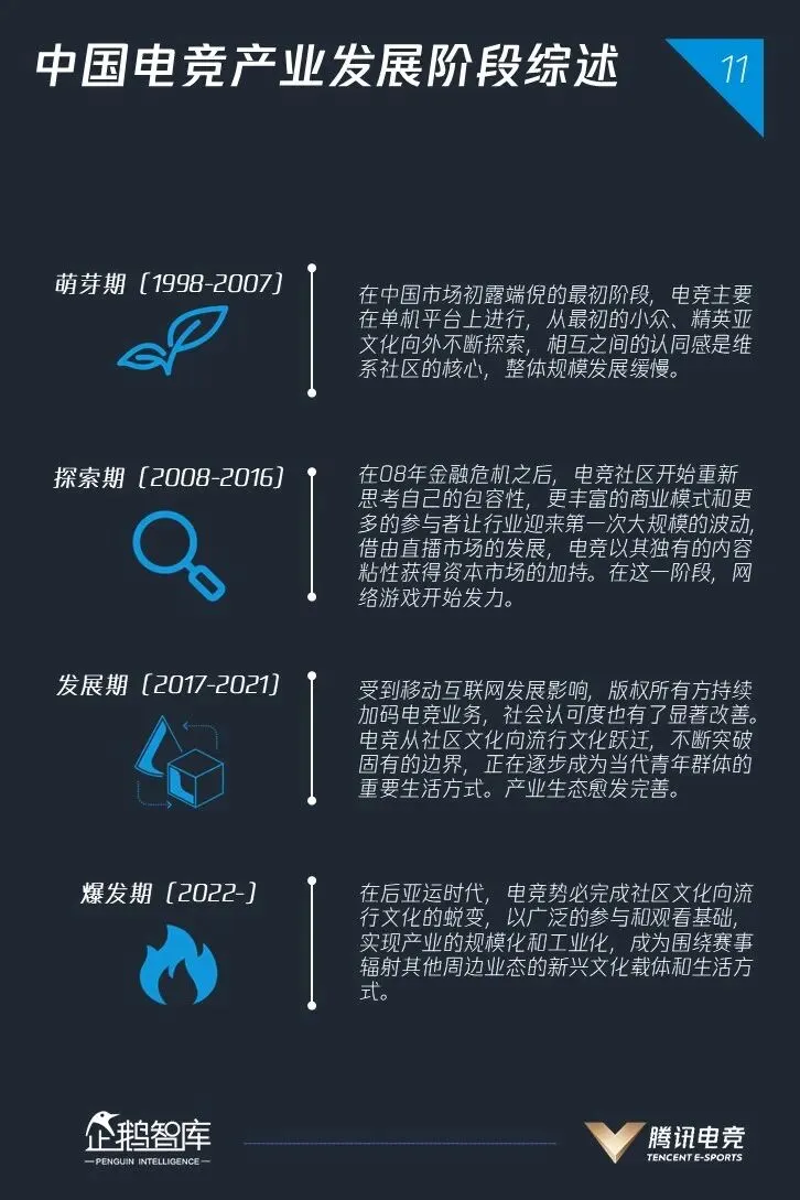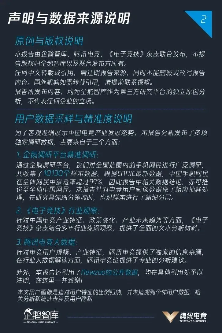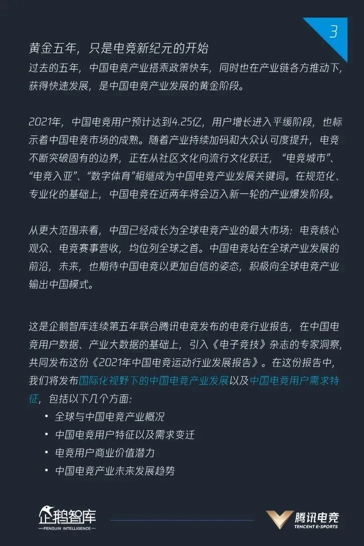 此次企鹅智库联合腾讯电竞发布的电竞行业报告,综合了中国电竞用户数据、产业大数据,和《电子竞技》杂志的专家洞察,最终共同完成这份《2021年中国电竞运动行业发展报告》。在这份报告中,我们将发布国际化视野下的中国电竞产业发展以及中国电竞用户需求特征,包括以下几个方面: