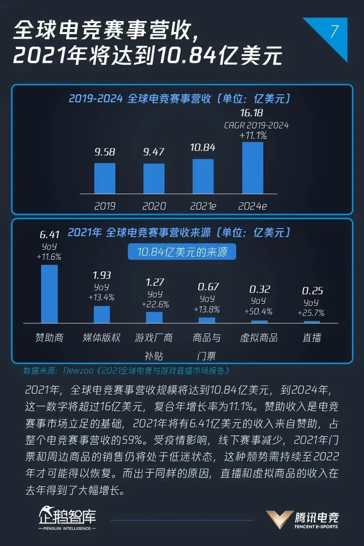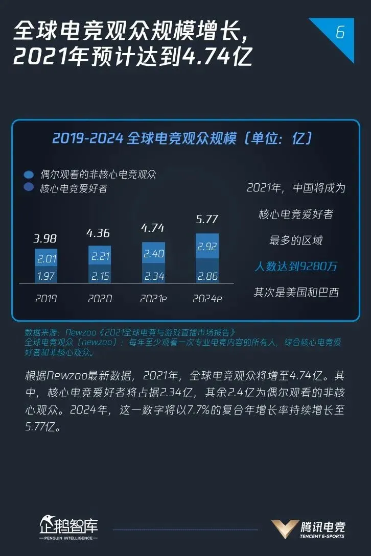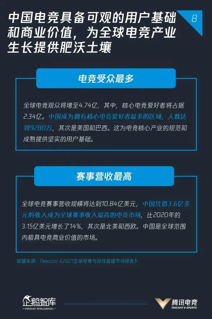 从更大范围来看,中国已经成长为全球电竞产业的最大市场——电竞核心观众与电竞赛事营收,均位列全球之首。