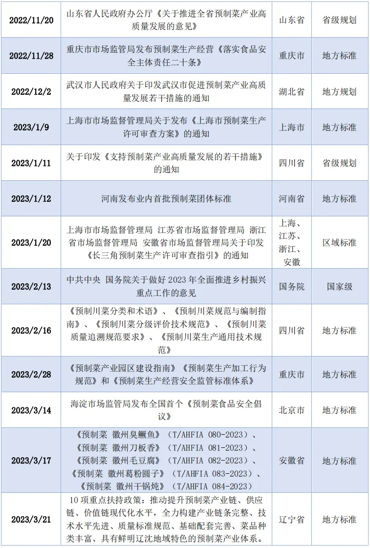 今年中央一号文件《关于做好2023年全面推进乡村振兴重点工作的意见》提出培育乡村新产业新业态,其中要求“提升净菜、中央厨房等产业标准化和规范化水平,培育发展预制菜产业”,这是预制菜首次被写入中央一号文件。预制菜产业一头连着田间地头,一头连着消费者餐桌,其快速发展既顺应了需求侧的变化,满足了消费者对美食的多元需求,也推动了农村一二三产业的融合发展,成为农业转型升级的新业态、农民“接二连三”增收致富的新渠道,为助力乡村产业振兴、实现共同富裕发挥重要作用。近年来,我国预制菜产业发展迅速,其产业链涉及农业生产、加工流通、餐饮服务、市场消费等多环节。预制菜的出现迎合了市场对效率与品质的需求,帮助餐饮企业实现降本增效,助力农产品的标准化,给消费者带来便捷体验。预制菜产业高速复合增长的同时,仍面临国家和行业标准不统一、质量难保证、C端市场待开发等风险与挑战。本报告基于现有行业数据和人民网独家数据(人民众云数据平台大数据),全面梳理行业发展状况,系统总结产业发展优势与劣势、机遇与挑战,并就如何推动行业发展提出建议,以供参考。一般认为,预制菜是指以农、畜、禽、水产品为原料,配以各种辅料进行预加工或预烹调而成的成品或半成品菜肴产品,包装后在常温、冷藏或冷冻的条件下贮藏、运输和销售,可直接食用或经简单烹饪后,作为日常正餐食用。预制菜种类丰富,按照食品的加工程度及食用的便捷性,可分为即食食品(如八宝粥、即食罐头)、即热食品(如速冻汤圆、自热火锅)、即烹食品(须加热烹饪的半成品菜肴)与即配食品(如免洗免切的净菜)。近几年,预制菜概念持续火爆。疫情期间,受居家餐饮需求迅速增长的影响,众多餐饮企业通过研发预制菜产品、推出预制菜行业供应链解决方案等形式抢占新赛道,从而推动预制菜市场规模持续快速增加。近几年,预制菜行业发展按下“加速键”,呈现市场规模稳步增长、发展潜力巨大,同时区域特征显著、行业集中度较低等特征。近三年来中国预制菜市场规模稳步增长,数据显示,2022年中国预制菜市场规模达4196亿元,同比增长21.3%。预计未来3-5年,中国预制菜市场规模有望以20%左右的高增长率逐年上升,在2023年达到5165亿元,在2026年达10720亿,我国预制菜产业有望发展成下一个万亿级市场。图2-1 中国预制菜行业市场规模及预测 (图片来自艾媒咨询《2022年中国预制菜产业发展白皮书》)从市场渗透率和行业竞争格局来看,根据《中国烹饪协会五年(2021-2025)工作规划》,目前国内预制菜渗透率只有10%-15%,预计在2030年将增至15%-20%。而美国、日本预制菜渗透率已达60%以上,中国预制菜市场还有较大的扩容空间。《2022年中国连锁餐饮行业报告》认为,受冷链运输、物流成本、销售渠道和资金等限制,目前我国的预制菜行业仍然处于前期探索阶段,虽然市场参与者众多,但总体上仍存在区域特征显著、规模以上企业较少、产品同质化现象明显、行业集中度低且高度分散等特点,竞争格局尚未定型。近年来预制菜产业蓬勃发展,已形成相对完整的产业链。产业链的上游为原材料供应型行业,主要包括农、牧、渔等种养殖业,米面粮油等农副产品初加工业以及食品包装等包装供应业。上游在预制菜产业链中的地位至关重要。预制菜的原材料成本占比较高,因此原材料价格变动对预制菜的成本影响较大。产业链中游为预制菜生产和加工业,主要负责净菜、半成品菜的生产加工,包括专业预制菜加工企业、传统速冻食品企业和餐饮企业等。产业链下游是预制菜的消费市场,基本分为B端和C端两大销售渠道。B端销售主要面向连锁餐厅、菜品批发市场、乡厨、酒店等,C端销售渠道是指食品企业或者餐饮企业在工厂完成预制菜加工后,通过餐饮门店、生鲜电商平台、商超等渠道销售给顾客。由于预制菜最初是为餐饮企业提升备菜效率而催化出来的产品,因此,当前预制菜市场主要以B端销售为主。数据显示,我国预制菜行业最大的需求来自餐饮行业,有85%以上的预制菜产品销售至B端。2020年以来,随着餐饮外卖行业的蓬勃发展和因疫情催生的家庭端消费需求变化,预制菜C端迎来消费加速期,销量大幅提升,预制菜从餐饮后厨逐步走入家庭餐桌。图2-2 中国预制菜行业产业链示意图(图片来自艾媒咨询《2022年中国预制菜产业发展白皮书》)目前,除了原料供应企业、预制菜专业生产企业、速冻食品企业、连锁餐饮企业和商超零售类企业等行业主要参与者,还有很多企业跨界加入,积极转型布局预制菜领域,开展相关生产经营。如格力电器、老板电器、海容冷链等企业从预制菜生产制造设备、冷链物流设备等电器生产领域切入预制菜产业;外卖、商超、生鲜电商等平台也纷纷入局,如饿了么成立专门团队优化细分行业运营,美团买菜、叮咚买菜等电商平台上也将预制菜在商品分类中单列出来;还有不少看起来与预制菜行业“毫不相关”的企业,则借助行业成熟的供应链,选择以产品为抓手,直接创立预制菜品牌。如地产巨头碧桂园集团进军预制菜产业,旗下广东碧乡科技发展有限公司推出“食机已道”系列鲟鱼预制菜品;快递行业龙头顺丰也宣布推出预制菜行业供应链解决方案,全面布局预制菜。预制菜产业链条长,在促进农产品深加工、食品制造转型、消费升级、创