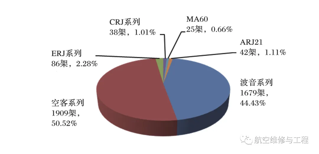 在3779架121航空公司在用航空器中,波音和空客两大飞机OEM制造商依旧占据国内运输航空器94.95%的市场, 波音机队为1679架(44.43%),空客机队为1909架(50.52%);其他ERJ、CRJ、MA60和ARJ21机型只占国内运输航空器机队的5.05%,如图1所示。