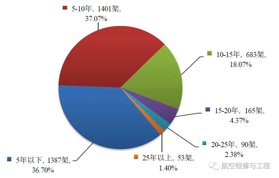 图2为2020年底国内在用航空器数量按机龄分布情况,整个机队平均机龄为7.53年,比2019年增加0.63年,机队平均机龄于2015年达到谷值(6.10 年)后呈逐年增加趋势。2020年在用航空器中10年以下机龄比例为73.78%;10-20年机龄比例为22.44%;20年以上机龄比例为3.78%,最大机龄为31.34年,为一架波音757-21B货机。