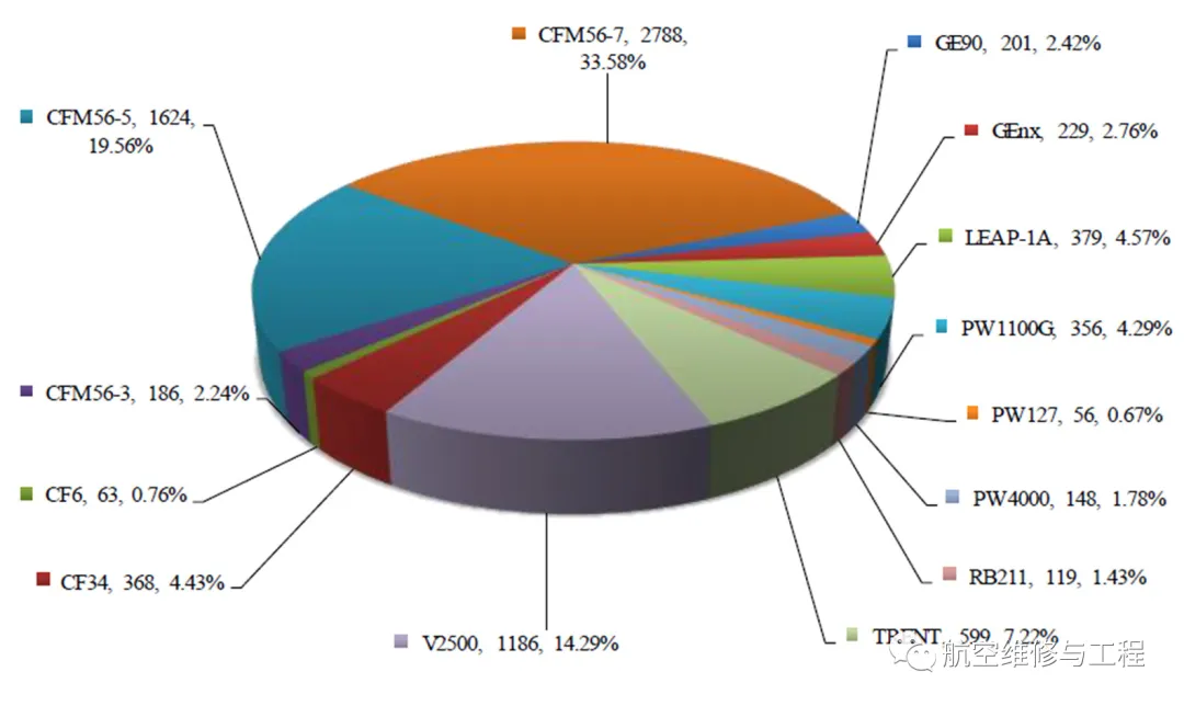 2020年底国内按CCAR-121部运行的航空公司在用发动机(含运行和备份状态)总数量为8302台,较2019年增加了1.95%,其中CFM56-7、CFM56-5 和V2500三个型号分别占据国内按CCAR-121部运行的在用发动机总量的33.58%、19.56%和14.29%,合计占比67.43%,如图3所示。